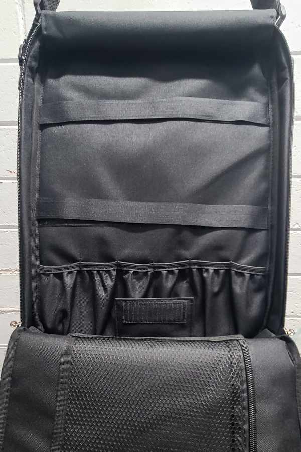 This bag has 6 knife slot pockets, but you can fit more than 6 knives in here, plus there are 2 velcro straps to secure your knives in place as you travel between jobs. This chef bag is tall enough for a steel to fit easily too. The knife backpack also has 2 more pockets for peelers, lighters and chef accessories, plus 3 pen and biz card pockets too! With room for a laptop, this over-the-shoulder design leaves your hands free when running to catch the bus on time! The heavy-duty construction will have you keeping this knife bag kicking for a while; it’s made to last.