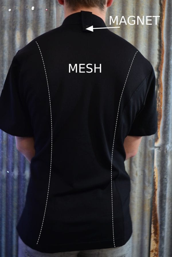 - Our best, newest R2R feature yet, magnets! Never again will the little front clasp near your collar bone come off, we’ve swapped the clasp with a magnet system! But it gets better, we’ve edited the back apron tab with a magnet too. YES, now our higher collars have a magnetic apron tab that prevents all annoying apron neck rub. The push stud that used to lock together is now a magnet, because chefs would forget it’s locked down, no more hard yank when you’ve forgotten it’s locked, accidentally ripping the back stud out of the jacket.