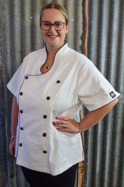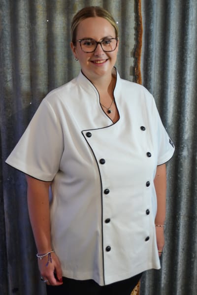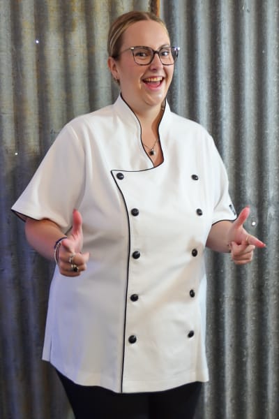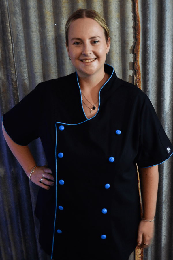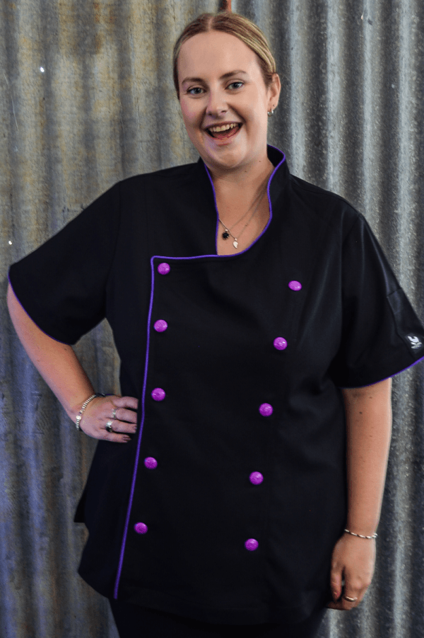 Our Rockzette plus size women’s chef jacket was designed to empower the fuller figure female chefs of today. Our plus size range helps bring colour and pizazz to every women’s chef wardrobe. Shake up your kitchen in fun, snazzy, feminine jackets that scream personality! The Rockzette’s are for those wonderful women out there wanting a well fitted complimentary chef jacket. No more ill-fitting unisex boring plain white jackets anymore. Stylish but professional, these bad girls are designed to make you look great and feel good while at work! The soft stretchy fabric blend keeps you comfortable and there’s no need to iron them either. The open neckline makes them easy to pull on and off over your head too, don’t spend time undoing all the buttons. Easy to wash, durable and fade-free, these are a must for the modern chef women of today. Our new design has big funky coloured buttons in the front double breasted area, like a traditional jacket, the front is interchangeable. But to get these on and off just whip them over your head the killer neckline makes this easy. Included with the jacket is a set of fabric button strip holders ( great for holding the buttons when washing your jackets) and 10 buttons to get you started. You can always purchase more if you want to swap colours or need more.
