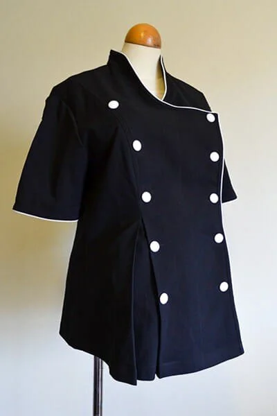 A modern twist on the original white & black chef jacket. This crisp white jacket with sharp black piping in a womanly cut gives you a professional edge. No more ill-fitting chef jackets made for men. The Rockzette jacket is designed by a female chef who wanted to design a chef jacket that actually made you look good while cooking. She was sick of cross-dressing in unisex Man-i-forms that chafed her. The old uniforms always needed adjusting and were way too big or far too small, so she came up with these modern funky ladies chef jackets. Now ready2rock can hardly keep up with demand. Handmade with lots of love these comfortable jackets can be just pulled over your head to put on and are very easy to work long hours in because of the soft slightly stretchy fabric. No ironing is necessary, just wash hang and GO! There’s buttons supplied with the Jacket and the Old Skool fabric strip button holders so you can put the buttons into them and easy to remove the buttons for washing. Inter-changeable front like the old traditional jackets, but better as you don’t need to undo the buttons – just pull on and off like a jumper – the neckline gives you the freedom to do that!. Jazz the white jacket up with colourful buttons to – you can buy extras from the R2R site.