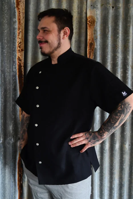 Get your chef wardrobe up to date and try our women’s long sleeve black Stud Muffin jacket today! These are a modern feminine push-stud chef jacket, which means no more of those damn pesky plastic chef buttons ever again! Have you ever got to work, realising you only have 4 chef buttons for you’re jacket? Or woken up in a hot sweat from that recurring chef dream, where thousands of chef buttons are chasing you until you nearly get eaten by them? Enough already! Stop! Make the change now and try these easy-to-wear, modern, cool and really comfortable womanly matt black push-stud jackets.